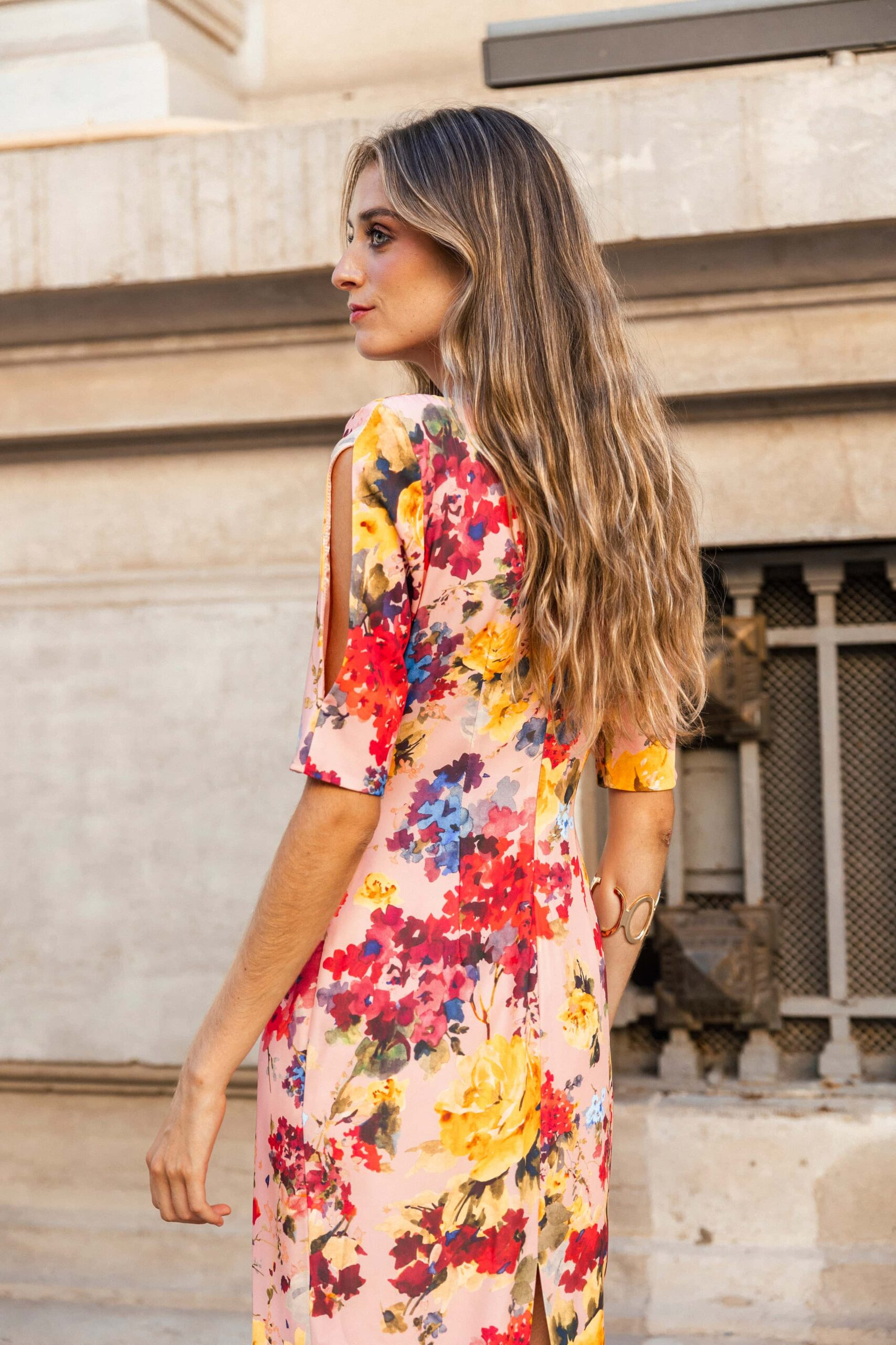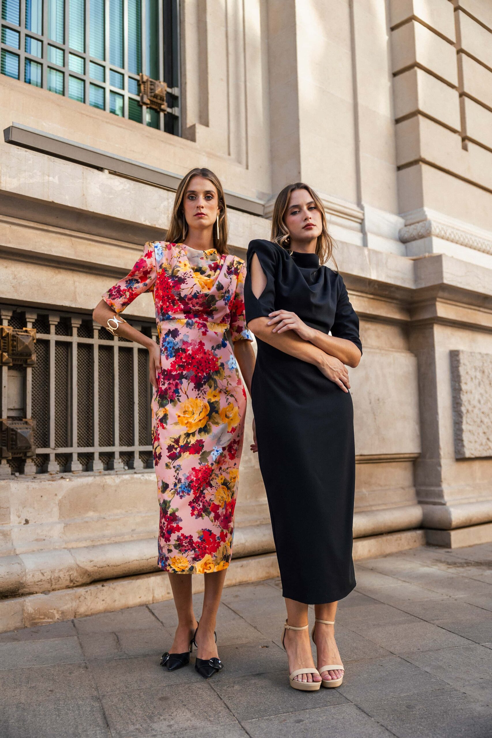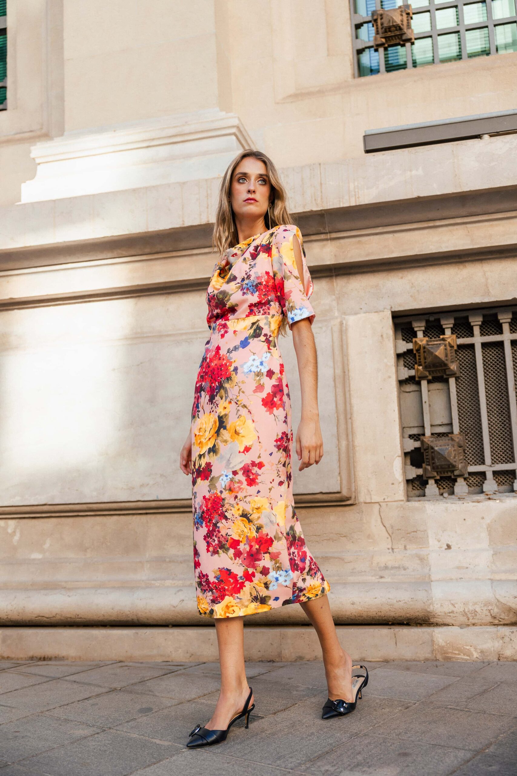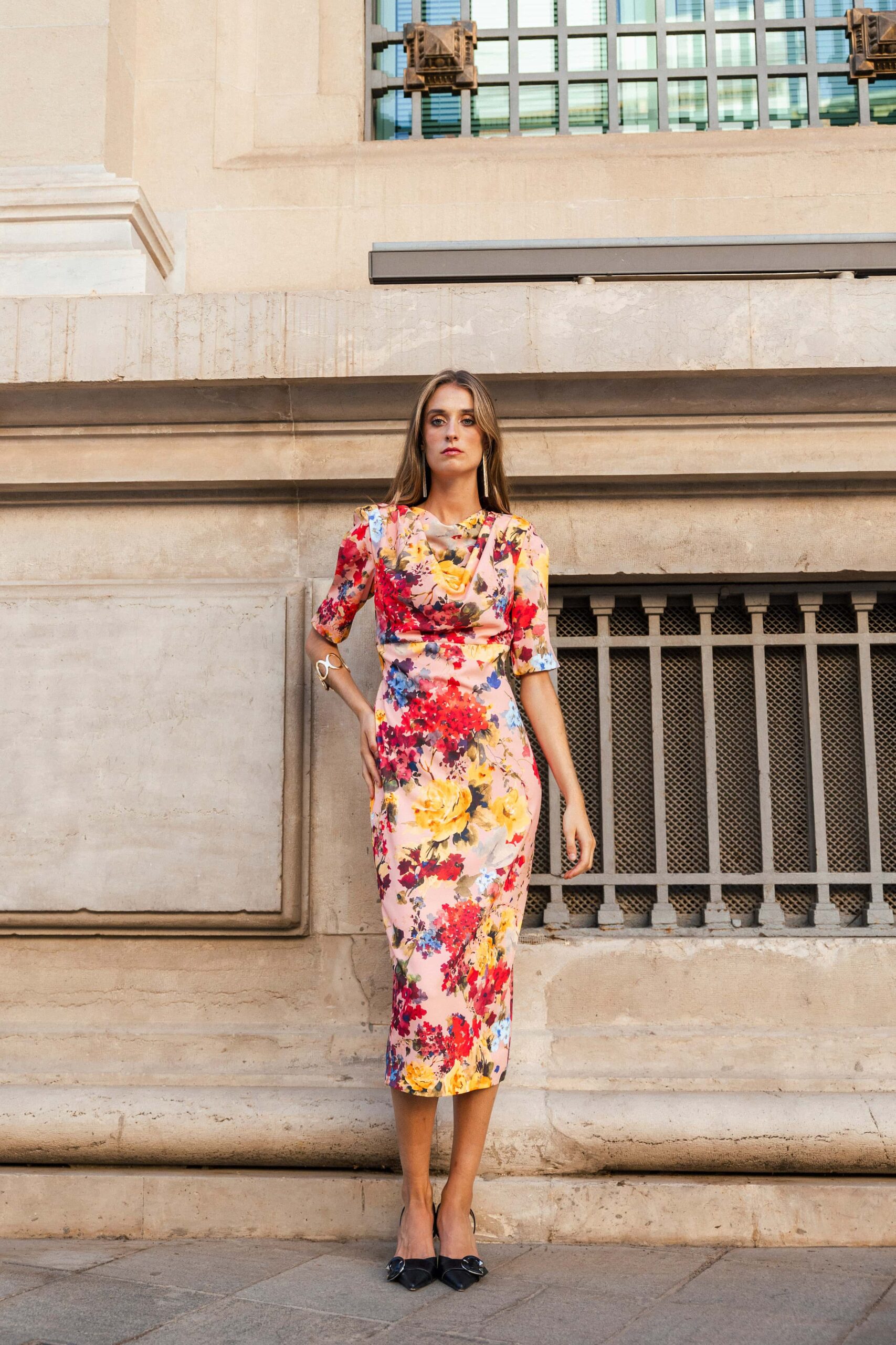 Vestido de fiesta largo midi con escote drapeado en cascada, mangas con hombreras tipo pagoda y abertura en forma de lágrima. Totalmente forrado para mayor comodidad y elegancia.